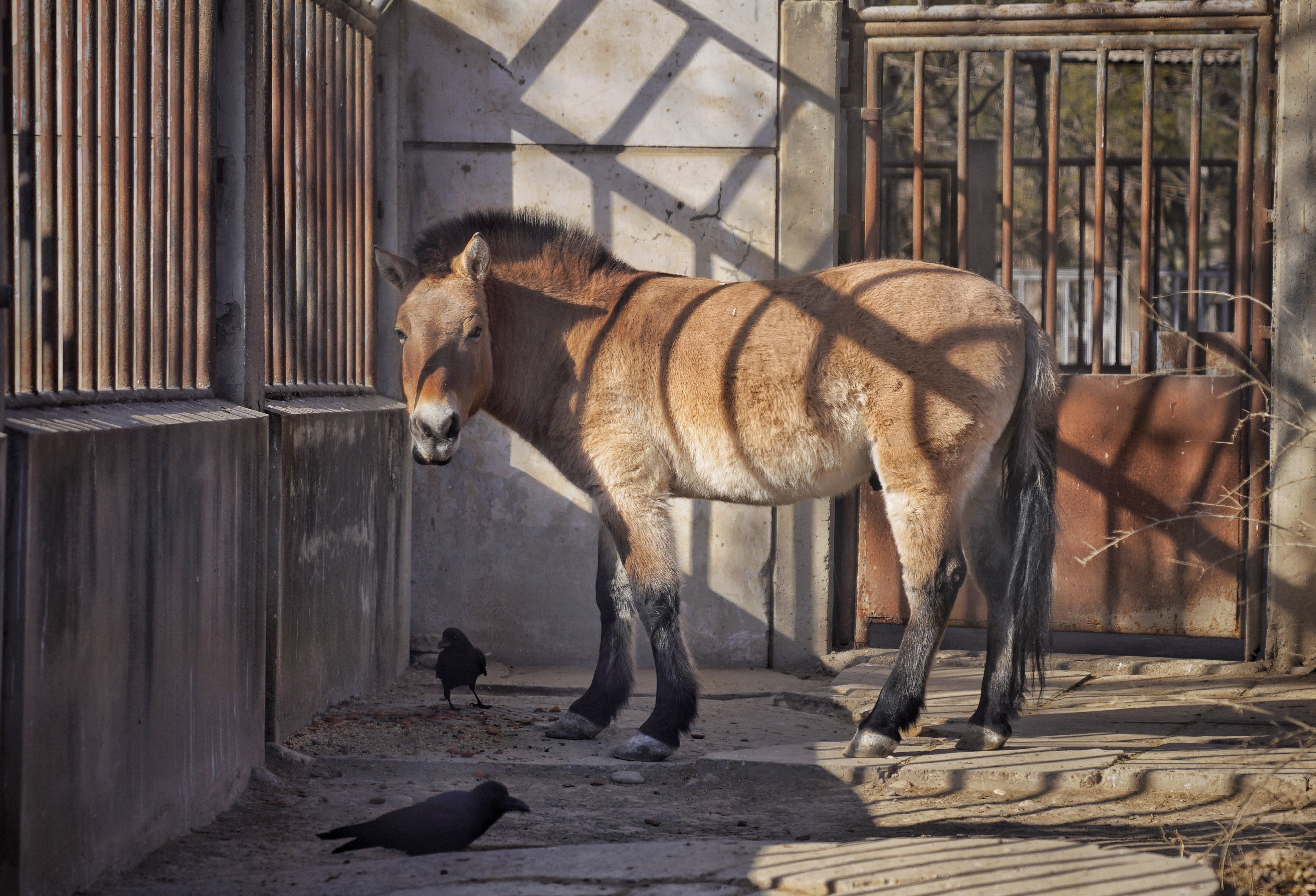 但从兽舍的“高规格”不难猜出它的独特地位。这是一个带有两间运动场的大兽舍,可供它敞开了溜达。院中央有一棵高大的梧桐树,尽管冬日繁花落尽,但从纵横交错的枝干便可想象出它枝繁叶茂的样子。夏天,梧桐树会洒下一大片阴凉,供普氏野马休息。